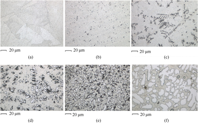 (f), as the Al content increases, the black dendritic structure first increases. When the Al content increased to 10%, the black dendritic structure gradually decreased. When the Al content increased to 30%, the black dendritic structures disappeared, and a silver-white structure with obvious grain boundaries was formed.