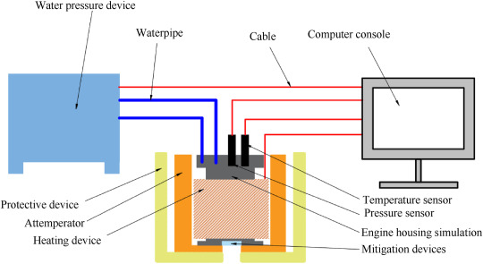 which mainly consists of the water pressure device, heating device, temperature sensor, pressure sensor, rocket motor case simulation, protective device, attemperator, mitigation devices and computer console. The maximum pressure boost rate is 12 MPa/min, the working pressure range is 20–100 MPa, and the maximum heating rate is 15 °C/min. Operating temperature up to 300 °C.