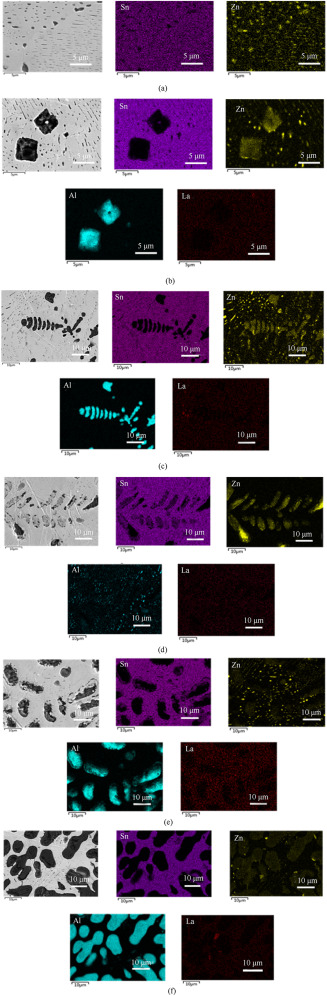 (f), with increasing Al content and La content, black Zn-rich precipitates distributed in the gray β-Sn matrix gradually decrease. In