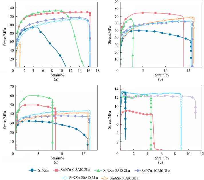 Tensile stress-strain curves of the Sn–9Zn alloys with Al and La at different temperatures.