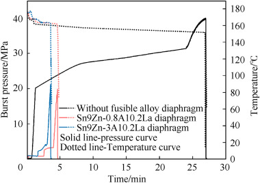 The hydrostatic pressure during the high-temperature test was carried out on the simulated motor case with a 3 mm thick fusible diaphragm. When the ambient temperature was 175 °C, the burst pressures of the simulated motor case with the Sn9Zn-0.8Al0·2La alloy fusible diaphragm and the Sn9Zn–3Al0·2La alloy fusible diaphragm were 19.88 MPa and 20.21 MPa respectively. By assembling the fusible diaphragm in the rocket motor case, the burst pressure of the shell can be reduced by approximately 50%, which can be applied to the design of mitigation devices for fusible alloys.
