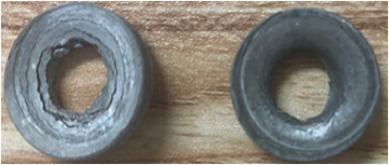 The rocket motor case simulation with a 3 mm thickness of the Sn9Zn-0.8Al0·2La alloy has a burst pressure of 19.88 MPa, and the rocket motor case simulation with a 3 mm thickness of the Sn9Zn–3Al0·2La alloy has a burst pressure of 21.21 MPa. The temperature of the fusible alloy diaphragm for Sn9Zn–3Al0·2La and Sn9Zn-0.8Al0·2La were 161.3 °C and 162 °C respectively when they broke. The diaphragm and the rocket motor case simulation after the hydrostatic pressure in the high-temperature test are shown in
